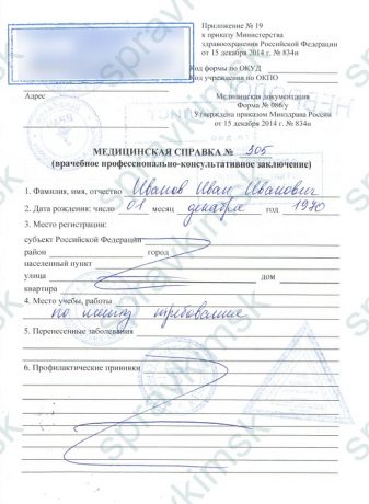 Для получения медицинской справки необходим прием и прохождение медкомиссии в клинике — с собой нужно иметь паспорт и амбулаторную карту и карту прививок и явиться в приемные дни. Также нужно получить заключение о состоянии здоровья у ЛОРа, терапевта, психиатра, невролога, хирурга и офтальмолога, получить флюорограмму и сдать общие лабораторные анализы мочи и крови. На основании результатов обследования выносится вердикт приемной комиссии о состоянии здоровья и отсутствии хронических болезней и противопоказаний для обучения и профпригодности. По результатам медицинского заключения студент, школьник или учащийся будет зачислен в группу для занятий физкультурой, наиболее подходящую ему по состоянию здоровья. Срок действия медсправки составляет 6 месяцев.