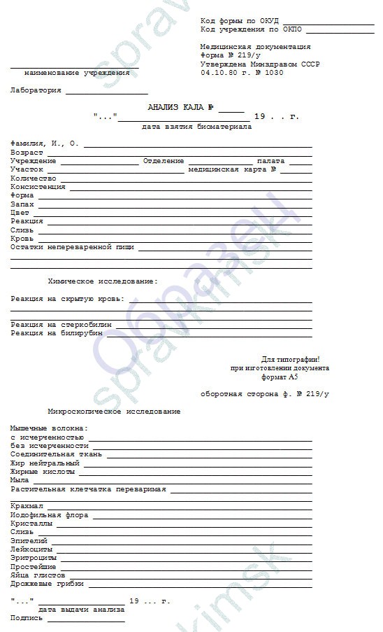 Справка 219/у (общий анализ кала по форме 219/у) это медицинский документ, в который приведены результаты о текущем состоянии организма, его тонусе, а также правильности функционирования отдельных систем организма, в частности пищеварительного тракта.