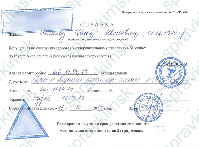 Справка в бассейн для плавания является официальным документом, об отсутствии инфекций и противопоказаний, срок действия которого составляет 6 месяцев с даты получения. Оформление происходит по форме № 1 для взрослых, детей и подростков. Медсправка оформляется на имя клиента в клинике на официальном бланке по результатам приема, осмотра и заключения комиссии — подписи и печати действительны и проставляются практикующими врачами.